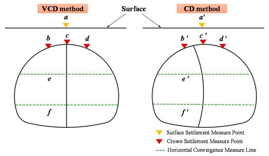 Figure 8 illustrates the positions of the measuring points. A measuring point for the surface settlement was arranged right above the tunnel, three measuring points for the crown settlement were arranged at the vault crown, and two measuring lines for the horizontal convergence were arranged at the arch springing and the side-wall.