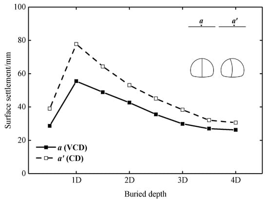 The relationship between the surface settlement and buried depth in Grade IV3 surrounding rock is shown in Figure 9. The surface settlements of the two methods have a similar trend in variation. With the increase in the buried depth, the surface settlement increases and the maximum is observed at the buried depth of D, and then shows a decreasing trend. This is because the disturbance area caused by the construction of the tunnel has reached the surface when the buried depth is shallow, and the surface settlement is the accumulated value of the stratum deformation above the tunnel, which increases with the increase in the buried depth (Stage 1 and 2 in Figure 10). On the contrary, when the buried depth is not less than the height of the disturbance area, the rock mass above the tunnel can achieve self-stabilization. The value of the surface settlement is mainly affected by ground loss and geotechnical properties, and the construction influence on the surface decreases with the increase in the buried depth (Stage 3 and 4 in Figure 10). As shown in Figure 9, the surface settlement of the CD method is 30.6–77.8 mm, and that of the VCD method is 26.2–55.5 mm. Compared with the CD method, the surface settlement of the VCD method is reduced by 14.4–28.7%, and the maximum reduced value of 22.3 mm and minimum reduced value of 4.4 mm are observed in Case1-2 and Case1-8, respectively. Furthermore, the reduced values observed in Case1-1 to Case1-4 are greater than 10 mm. The results indicate that the surface settlements in Grade IV3 surrounding rock can be reduced by more than 20% with the VCD method when the buried depth is 0.5D–3D.