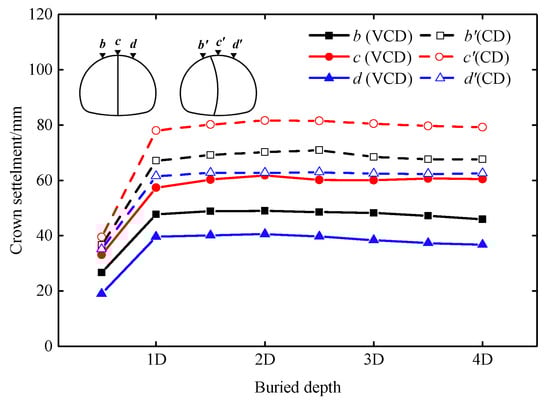 The relationship between the crown settlement and buried depth in Grade IV3 surrounding rock is shown in Figure 11. The crown settlements of the two methods have a similar characteristic in variation and distribution. With the increase in the buried depth, the crown settlements increase and the maximum is observed at the buried depth of D, and then remains substantially constant. This is because the crown settlements are mainly caused by the extrusion between the primary support and the surrounding rock in the upper part of the disturbed area. As shown in Figure 10, when the buried depth is shallow, the weight of surrounding rock in the upper disturbed area increases with the increase in the buried depth. However, when the buried depth is deep, the weight of the surrounding rock in the upper disturbed area remains a constant value. As shown in Figure 11, the left, middle, and right crown settlements of the CD method are 36.6–70.9, 39.5–81.6, and 35.2–63.0 mm respectively, and those of the VCD method are 26.7–49.0, 33.1–61.8, and 19.0–40.6 mm respectively. Compared with the CD method, the left, middle, and right crown settlements with the VCD method are reduced by 27.0–32.1%, 16.2–26.4%, and 35.2–46.0%, respectively. The reduced values observed in Case1-2 to Case1-8 are approximately 20 mm. The results indicate that the crown settlements in Grade IV3 surrounding rock can be reduced by more than 20% with the VCD method when the buried depth is D–4Dm, and the reduced value on the right side of the crown is more than 35%.