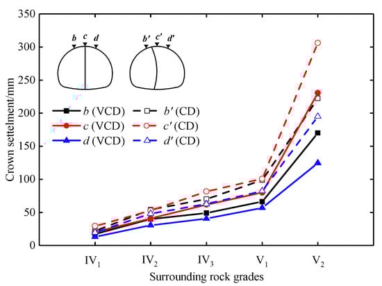 Figure 14 shows the relationship between the crown settlement and grade of surrounding rock in a buried depth of 20 m. It is clear that the variations in the crown settlements are similar to that of the surface settlements. This happens because the lower the surrounding rock strength, the larger the disturbance area caused by the tunnel construction, and the higher the pressure on the vault crown. Therefore, the crown settlements increase as the surrounding rock changes from Grade IV1 to Grade V. As shown in Figure 14, the left, middle, and right crown settlements of the CD method are 22.2–222.2, 29.4–306.2, and 19.8–194.8 mm, respectively, and those of the VCD method are 17.3–169.9, 20.4–230.4, and 13.1–124.5 mm, respectively. Compared with the CD method, the left, middle, and right crown settlements of the VCD method are reduced by 22.1–32.7%, 20.6–30.6%, and 30.9–36.6%, respectively. The results indicate that the crown settlement can be reduced by more than 20% with the VCD method in a buried depth of 20 m when the surrounding rock is Grade IV1 to Grade V2.