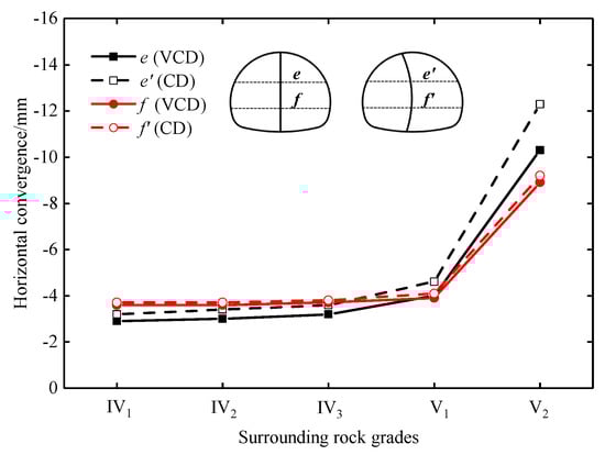 Figure 15 shows the relationship between the horizontal convergence and grade of surrounding rock in a buried depth of 20 m. The variations in the horizontal convergence are similar to that of the surface settlement and the crown settlements. This is because the crown settlement in Grade V2 surrounding rock is too large, which causes the global deformation of the primary support, resulting in a sudden increase in the horizontal convergence. As shown in Figure 15, the arch springing convergence of the CD method is 3.2–12.3 mm, and that of the VCD method is 2.9–10.3 mm. The side-wall convergence of the CD method is 3.7–9.2 mm, and that of the VCD method is 3.6–8.9 mm. Compared with the CD method, the arch springing convergence and the side-wall convergence of the VCD method are reduced by 9.4–16.3% and 2.6–4.9%, respectively. Furthermore, the reduced value of the horizontal convergence in each case is equal to or less than 2 mm. The results indicate that the VCD method has no significant effect on the reduction of the horizontal convergence in Grade IV and Grade V surrounding rock.