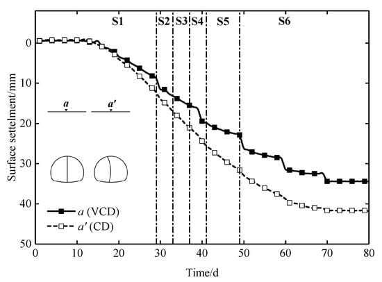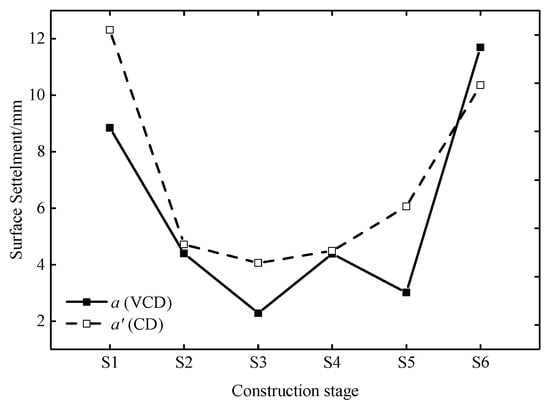 The time history curves of the surface settlement at the measuring points a (VCD model) and aʹ (CD model) are shown in Figure 18. The two points begin to settle almost at the same time. The time history curve of the surface settlement with the VCD method is stepped, and that with the CD method is smooth. Compared with the CD method, the total surface settlement of the VCD method is reduced by 18%. The comparison of the surface settlement in each construction stage is shown in Figure 19. The surface settlements of the VCD method in Stage 1, 2, 3, 4, and 5 are smaller than those of the CD method, while the surface settlement of the VCD method in Stage 6 is larger. The reduced values of the surface settlement in Stage 1, 2, 3, 4, 5, and 6 are 3.5, 0.3, 1.8, 0.1, 3.1, and -1.3 mm, respectively. This is because the support structure forms a closed cycle in Stage 3 and Stage 5, and the supporting performance of the vertical center diaphragm can be exerted well. The comparison of the settlement troughs is shown in Figure 20. The widths of the settlement troughs of the two methods are approximately equal, and the value is 90m(9D), while the depths of the settlement troughs of the two methods are different, and the values are 34.6 and 42.0 mm, respectively. Furthermore, the settlement tanks are symmetrical along the tunnel centerline.