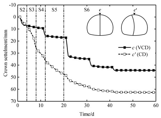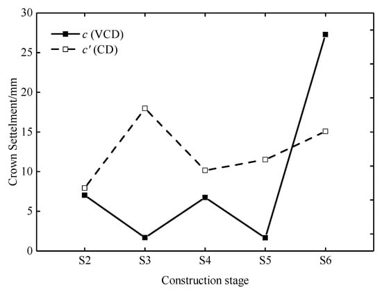 The time history curves of the crown settlement at the measuring points c (VCD model) and cʹ (CD model) are shown in Figure 21. It is observed that the growth trend of the crown settlement is similar to that of the surface settlement. Compared with the CD method, the total crown settlement of the VCD method is reduced by 29%. In Stage 2, as the support structure is not closed, the settlement rates of the two methods are approximately the same and relatively fast. In Stage 3, 4, and 5, the crown settlement of the CD method still increases rapidly, while that of the VCD method increases slowly and has a sudden change caused by the demolition of the center diaphragm of the previous construction cycle. In Stage 6, the crown settlement of the CD method increases more and more slowly, and stabilizes at 62.6 mm, while that of the VCD method first increases sharply, and stabilizes at 44.4 mm. The crown settlement caused by the demolition of the center diaphragm of the VCD method accounts for 34% of the total crown settlement. The comparison of the crown settlement in each construction stage is shown in Figure 22. The crown settlements of the VCD method in Stage 2, 3, 4, and 5 are smaller than those of the CD method, while the crown settlement of the VCD method in Stage 6 is larger. The reduced values of the crown settlement in Stage 2, 3, 4, 5, and 6 are 0.9, 16.3, 3.4, 9.8, and -12.2 mm, respectively. The results indicate that the crown settlement caused by excavation can be reduced with the VCD method.