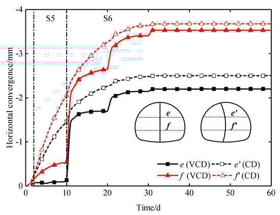 The time history curves of the horizontal convergence are shown in Figure 23. The growth trend of the horizontal convergence is similar to that of the crown settlement. This proves that the horizontal convergence is related to the crown settlement due to the global deformation of the primary support. The horizontal convergence caused by the demolition of the center diaphragm of the VCD method accounts for more than 60% of the total value. The difference values of the arch springing convergence and side-wall convergence between the two methods are 0.3 and 0.2 mm, respectively. The results indicate that the VCD method has no significant effect on reducing the horizontal convergence.