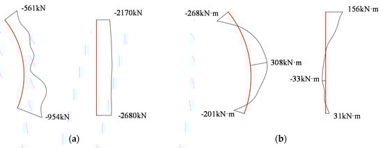 The connection between the center diaphragm and the primary support is the weak node of the CD method, which poses a significant threat to construction safety. The internal forces of the center diaphragm are shown in Figure 24. As shown in Figure 24a, the axial force distribution of the curved center diaphragm is uneven, which is large at both ends and small in the middle, while the axial force distribution of the vertical center diaphragm ranges between 2170 and 2680 kN. The maximum axial force of the vertical diaphragm is about three times that of the curved diaphragm. This shows that the vertical diaphragm can transfer the surrounding rock pressure from the crown more effectively. As shown in Figure 24b, the bending moment of the curved center diaphragm is negative at both ends and positive in the middle. The distribution of the vertical center diaphragm is the opposite of the distribution of the curved center diaphragm, with a positive bending moment at both ends and a negative bending moment in the middle. This is because the curved diaphragm is bent towards the right side under the vertical earth pressure, and the lateral earth pressure of the right side is too small to resist the deformation. However, under the lateral earth pressure of the right side, the vertical diaphragm is bent towards the left side. The maximum bending moment of the vertical diaphragm is about 1/3 that of the curved diaphragm. This indicates that the safety of the connection between the vertical diaphragm and primary support is more easily guaranteed than that between the curved diaphragm and primary support with the large axial force and the small bending moment.