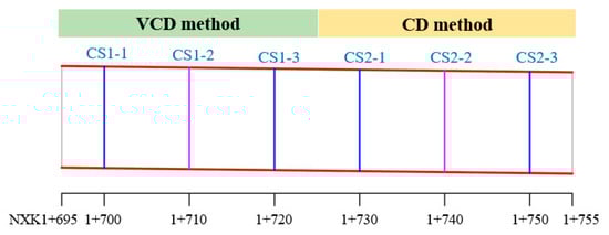 In order to prove the validity of the calculation results and study the mechanical properties of the two methods further, a comparative test area in Grade IV3 surrounding rock with a buried depth of 20 m was set up at the south line of the Shenzhen Eastern Transit Expressway Connection Line Tunnel. As shown in Figure 25, the length of the test area is 60 m, with the total stake number of NXK1+695–NXK1+755. The area with the stake number of NXK1+725–NXK1+755 was excavated by using the CD method, and another section with the stake number of NXK1+695–NXK1+725 was excavated by using the VCD method. The geological profile of the test area is shown in Figure 17.