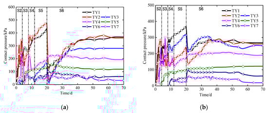 Six measuring sections CS1-1, CS1-2, CS1-3, CS2-1, CS2-2, and CS2-3 were set in the test area, in which the surface settlement, crown settlement, and horizontal convergence were measured and recorded. The arrangement of measuring points is the same as that in Section 3.1. The surrounding rock pressure and stress of the steel arch were measured in CS1-2 and CS2-2, and the arrangement of measuring points is shown in Figure 26. In Figure 26a, TY1–TY7 were the measuring points of the surrounding rock pressure. In Figure 26b, WG1–WG7 were the outer measuring points of the steel arch stress, and NG1–NG7 were the inner measuring points of the steel arch stress.