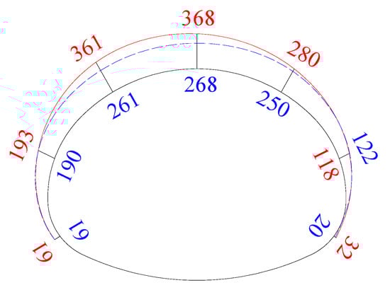 The envelope diagram of the asymptotic values of the surrounding rock pressure in Stage 6 is shown in Figure 29, the surrounding rock pressures of the two methods were irregular, which were larger at the arch and smaller at the side-walls. The pressure scale of the VCD method was 32–368 kPa, while that of the CD method was 20–268 kPa. On the whole, the surrounding rock pressures of the two methods were almost equal, but the surrounding rock pressures of the VCD method were more affected by the demolition of the center diaphragm.