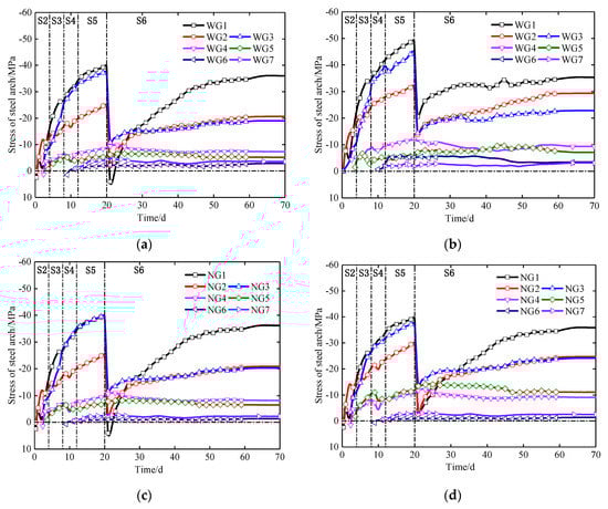 Time history curves of the stress on the steel arch. (a) Outer edge of the VCD method; (b) outer edge of the CD method; (c) inner edge of the VCD method; (d) inner edge of the CD method.