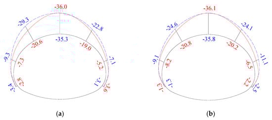 Figure 27 shows the time history curves of the settlement and convergence, including the field measurements in black and the results from the numerical calculation in red. It is clear that the deformation development trends in the field test were consistent with the results of the numerical calculation. The difference between the measured value and the calculated value was less than 3 mm. As shown in Figure 27a, the average value of the surface settlement of the CD method was 42.8 mm, and that of the VCD method was 31.4 mm. Compared with the CD method, the total surface settlement of the VCD method was reduced by 26%. As shown in Figure 27b, the average value of the crown settlement of the CD method was 63.3 mm, and that of the VCD method was 42.0 mm. Compared with the CD method, the total crown settlement of the VCD method was reduced by 34%. As shown in Figure 27c,d, the average value of the arch springing convergence of the CD method was −2.7 mm, and that of the VCD method was −2.1 mm. The average value of the side-wall convergence of the CD method was −4.3 mm, and that of the VCD method is −3.4 mm. The reason for such a behavior is that the primary support of the tunnel was mainly affected by the vertical earth pressure, and the vertical center diaphragm provided sufficient resistance, which reduced the crown settlement caused by excavation. When the center diaphragm was demolished, the primary support had been closed into a ring, which could effectively resist the deformation of the tunnel caused by the secondary disturbance. Due to the small lateral earth pressure, the advantage of the curved central diaphragm could not be exerted, and there was no significant difference in the horizontal convergence of the two methods.