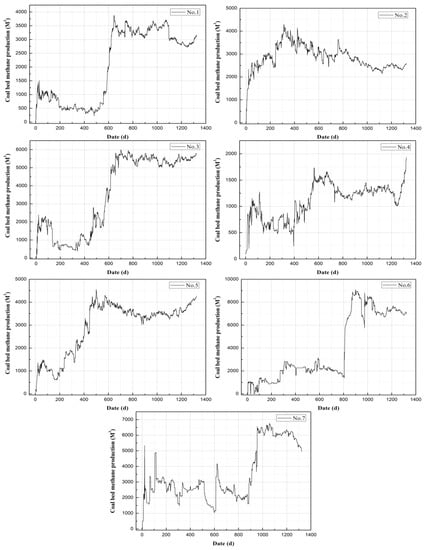 Time series of coalbed methane (CBM) daily production for the seven wells.