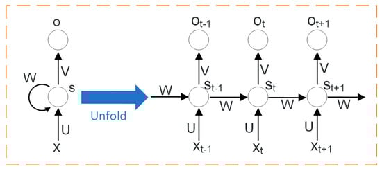 LSTM is a special kind of recurrent neural network (RNN) that can effectively solve the gradient disappearance or explosion problem of RNN through long-term dependence of time series analysis [,,,,,,]. Unlike traditional neural networks, RNN has hidden nodes that are connected, with the current output of a time series related to the output before it, so that the time sequence characteristics of data can be taken into account. The structure of a typical RNN network is shown in Figure 2. The left side represents a network element, and the right side is the unfolded form of multiple network elements, where t represents a time series, X input values, and St memory at time t. W, U, and V represent the weights of the input, the moment, and the output, respectively, and O represents the output values. RNN can capture timing features but can solve only short-sequence problems; it does not work for long-sequence data such as CBM daily production.