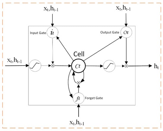 LSTM can overcome the shortcomings of RNN and features long-term memory. A typical LSTM network cell structure is shown in Figure 3, where Cell represents a memory cell; Xt and ht represent the input and output at time t, respectively; and ht–1 represents the output at the previous time. The LSTM network structure solves the RNN gradient problem through three “gates”: a “forget gate”, an “input gate”, and an “output gate”. The “forget gate” decides which information to discard and which to retain, the “input gate” controls the information input to the cell, and the “output gate” controls the output information. The hidden layer structure of the LSTM network can be calculated by the following equations: