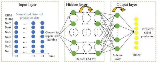 LSTM is suitable for analyzing time series, being a deep learning recurrent neural network structure that can learn long-term sequence data []. With the development of deep learning, the LSTM model has achieved satisfactory results in many aspects. In time series prediction, for example, many scholars [,,,] have applied the LSTM model to predict the fine particulate matter (PM2.5) concentration of air pollution and obtained more accurate predictions than by existing methods. Chen [], Tian [], and Li et al. [] studied traffic flow using an LSTM model. Ma et al. [] used LSTM and Beijing microwave traffic detection data to predict traffic speed and found that a LSTM network predicted accuracy and stability better than traditional neural network and other parametric or nonparametric algorithms did. Fischer [] and Kim et al. [] used the LSTM model to make predictions about financial markets and found that the results were better than the results of random forest, deep neural network (DNN), and other methods. Peng [] and Fang et al. [] used the LSTM model to predict electricity prices and electricity sales. Sagheer et al. [] proposed a deep long short-term memory (DLSTM) oil production prediction method based on genetic algorithm optimization and compared it with statistical and software calculation methods, finding that the proposed DLSTM model was more accurate under different comparison standards. Wang [] analyzed the time series of mine gas leakage based on the deep learning method but did not predict CBM production. Although LSTM models have been widely used in time series analysis, they are still relatively new in CBM production forecasting. In this study, the LSTM model was applied to predict CBM production, leading to discussion of the feasibility of using deep learning to predict CBM production.
