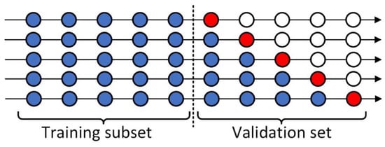Cross-validation is needed for optimal parameter selection. For machine learning and deep learning, there are many traditional cross-validation methods, such as the leave-one-out cross-validation method and the k-fold cross-validation method [,]. However, these methods cannot be used in time series prediction, because time series data are time-dependent. To solve this problem, rolling-origin recalibration evaluation was adopted in this paper []. The training set was divided into two parts, with the first 50% the training subset and the second 50% the validation set. In the forward rolling validation, the data from the validation set were moved to the training subset in chronological order. Our cross-validation process is shown in Figure 6, with blue circles representing training data, red circles validation data, and hollow circles unused data. We performed a split of the validation set five times, each time using 10% of the data for verification and then moving it to the training subset in chronological order for the next training process.