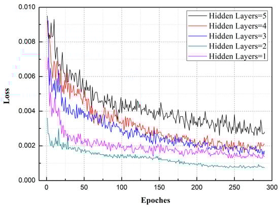The optimal number of hidden layers was selected by experiments from 1 to 5. To improve the generalization ability of the model and prevent overfitting, the dropout function was included in the LSTM model and 20% of the nodes were discarded. The loss function used was MSE. Corresponding to the different numbers of hidden layers (1, 2, 3, 4, 5), the LSTM network was trained, and the number of hidden layers was selected by comparing the loss variation of the model, as shown in Figure 7. As can be seen from Figure 7, with two hidden layers, the loss obtained was at its minimum (less than 0.001). Accordingly, two hidden layers were selected to train the LSTM model. The more hidden layers used, the longer the network training time required. Accordingly, using more hidden layers in a network does not necessarily produce better network training. As can be seen from the results, use of too many layers not only reduces training accuracy but also greatly increases training time.