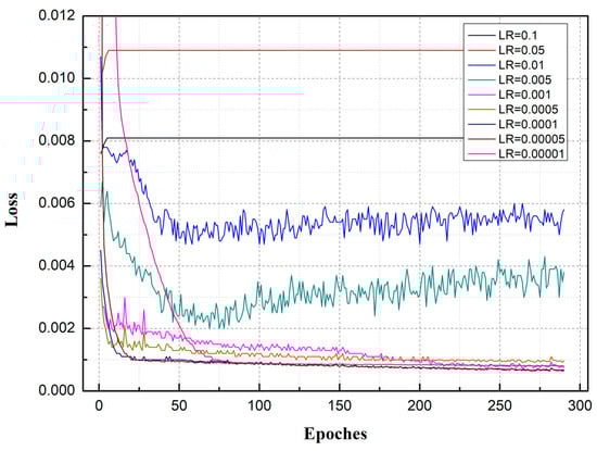 The learning rate was found to directly affect the training result of the model. If the learning rate was too high, the model was not trained accurately. Conversely, too small a learning rate increased network convergence time. Through experimentation, the hidden layer’s number of LSTM networks was fixed at 2, and different values of the learning rate were taken (LR = 0.00001, 0.00005, 0.0001, 0.0005, 0.001, 0.005, 0.01, 0.05, and 0.1) to explore the influence of learning rate value on the model. The variations in model loss, corresponding to different learning rates, are shown in Figure 8. As can be seen, when the learning rate was large (LR = 0.1, 0.05), the loss of the model did not gradually decrease with the epoch but rather increased to a certain value and stopped changing as the epoch increased. The model fit was poor. As the learning rate gradually decreased (LR = 0.01, 0.005), the loss error gradually decreased as the epoch increased. However, as the epoch continued to increase, loss error increased instead of decreasing and was mostly in a state of shock. When the learning rate decreased to 0.001, loss value decreased with increases in epoch and gradually stabilized. When the learning rate decreased to 0.0001, loss value reached its minimum value (less than 0.001) and model accuracy its highest value (with RMSE, MAE, and MAPE at their minimum values). As the learning rate continued to decrease, the loss value no longer decreased significantly but the precision of the model started to decrease (RMSE, MAE, and MAPE became larger). These findings show that when LR = 0.0001, the model can achieve a better fit and achieve the highest accuracy. Accordingly, a learning rate of 0.0001 was adopted to train the LSTM network.