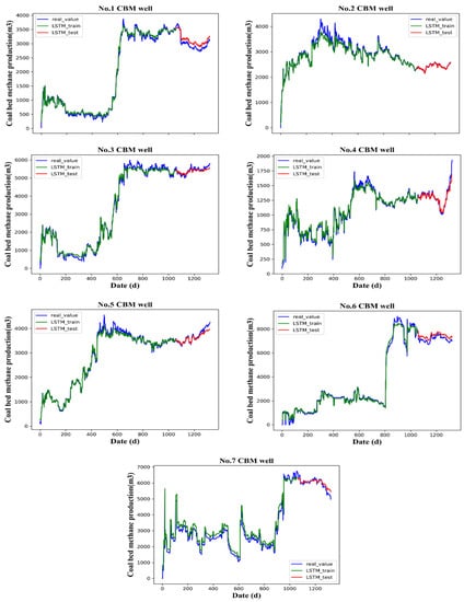 We trained the T-LSTM model through cross-validation and finally determined the optimal structure and parameters of the network. Then, the LSTM model was used to predict the CBM production of seven wells. The final prediction of CBM production is shown in Figure 9 (No. 1–No. 7), with blue representing measured data, green the LSTM network output result of the training set, and red the prediction of the T-LSTM network for the test set. It can be seen that time series analysis of daily CBM production by T-LSTM can achieve accurate results. The predicted CBM production by the T-LSTM network was close to the actual production. The predicted production of wells 2 and 4 was the most consistent with actual production. From the results, the predicted values are evenly distributed on both sides of the true values, indicating that the predicted results are unbiased. Although the results for wells 1, 6 and 7 were significantly lower than those of other sample areas, the predicted values deviated farther from the true values, the overall estimated values were higher than the true values, and the predicted results were biased.