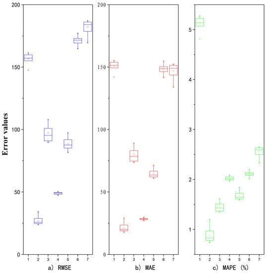 For the LSTM network, different results were obtained by each network training. To avoid the contingency of network training and develop a robust LSTM network, 30 independent repeat experiments were conducted on the CBM production data for each gas well. After setting the network parameters, training for each well was repeated 30 times, with RMSE, MAE, and MAPE values obtained for each repeat. Then boxplots were used to statistically analyze the RMSE of the 30 experiments, with RMSE, MAE, and MAPE distributions used to verify the stability of the T-LSTM network. Thirty independent repetitions sufficed to obtain a good distribution of these three indicators. The boxplots for the seven wells are shown in Figure 10. It can be seen that the RMSE, MAE, and MAPE results obtained from the 30 network trainings were concentrated, with a small interval between the upper and lower quartiles indicating a small distribution range and good stability of the LSTM network. From the boxplots, we can clearly see that the prediction result for well 2 was the most accurate, featuring the smallest RMSE, MAE, and MAPE values. The prediction results for wells 1, 6, and 7 were relatively poor, featuring large values of RMSE, MAE, and MAPE. Based on analysis of the change curves of production with time, the gas production of well 2 entered the stage of stable and continuous CBM production earlier, so the prediction result was relatively accurate. However, for types such as well 6, having low output or unstable output at the early stage, neural networks have not yet learned the characteristics of the time series of the curves well, making it difficult to grasp the time node of the output change and thus to forecast results for these types with a high degree of accuracy.