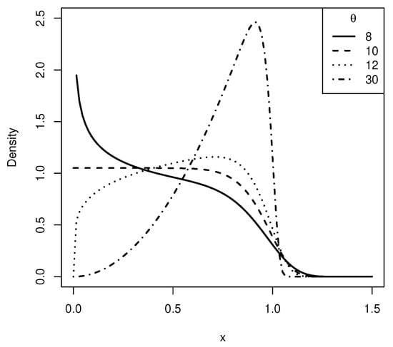 We define a slashed quasi-gamma random variable represented as in Equation (2) assuming for X a generalized gamma distribution, GENG . The choice of the value 1/10 for the parameter k of the GENG distribution is not arbitrary. Despite the fact that the particular case () is not itself popular in the statistical literature, we observe that it corresponds to a distribution of two well-identified parameters, scale and shape, respectively. Therefore, it does not present the identifiability problem presented by the general case (k free). Just as importantly, we note that the respective density function presents monotonic decreasing or unimodal shapes with particular concavity characteristics, presenting more than two inflection points for certain values of parameter , see Figure 1. This concavity characteristic differs from that of the other particular cases of the GENG distribution, mentioned above.