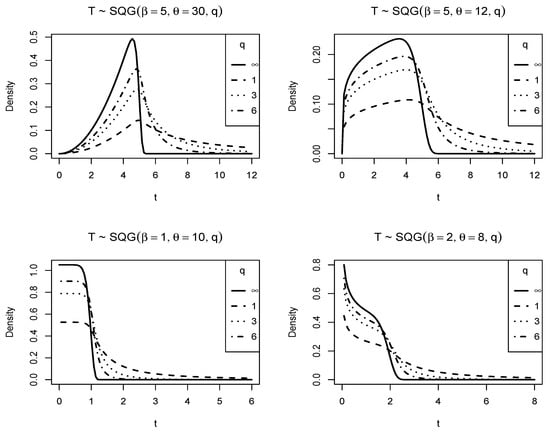 Note that, consistent with Definition 1, the first result shows that the density of the SQG distribution tends to the density function of the GENG () distribution as q tends to ∞. The second result shows that the SQG distribution function can be written in terms of the generalized gamma distribution function and the SQG density function. This result allows the SQG distribution function to be easily computed, without the need to consider a numerical integration of the respective density function. In the context of survival analysis, the survival and failure rate functions for the SQG distribution can be easily computed using this result. Figure 2 presents some curves of the SQG density function for different values of its parameters. Here, we observe that is a scale parameter (see left top panel), is a shape parameter that supports transitions between monotonic and unimodal shapes (see right top panel), and q has an important effect on the tails of the distribution, being heavier when q assumes small values within its parametric space (see bottom panels). Note that the SQG density tends to the limit case of the GENG () density as q tends to ∞.