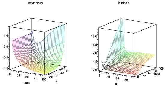 which are, respectively, the asymmetry and kurtosis coefficients for . Figure 3 depicts plots of the asymmetry and kurtosis coefficients for the slashed quasi-gamma distribution. We observe that the SQG distribution can present both positive and negative asymmetry. For a high value of q (fixed q), the asymmetry decreases for negative values as θ increases. For a small value of q, the asymmetry has a decreasing-increasing behavior (but always positive) as θ increases. Similarly, for a low value of θ (fixed θ), asymmetry is not significantly affected by the parameter q. For a high value of θ, the asymmetry decreases as q increases. Regarding the kurtosis of the distribution, it is clearly observed that the highest kurtosis values are obtained when q takes small values. The effect of the parameter θ on the kurtosis of the distribution varies depending on the value assumed by q. If q assumes small values, the effect of θ on kurtosis is important.