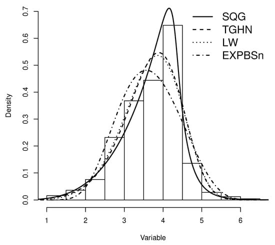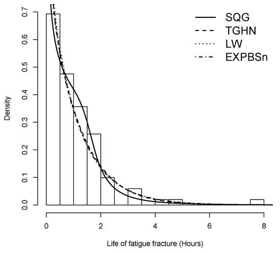 Table 3 presents ML estimates and SE (in parentheses) for the transmuted generalized half-normal (TGHN) [], Lindley–Weibull (LW) [], exponentiated BS normal (EXPBSn) [], and SQG distributions. For each model, the maximum value of the log-likelihood functions (LLF), the corresponding values for the Akaike information criterion (AIC) [], and Bayesian information criterion (BIC) [] are also shown. It should be noted that both AIC and BIC show a better fit with the SQG model.