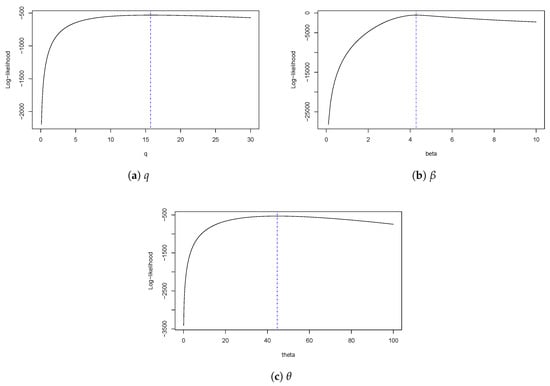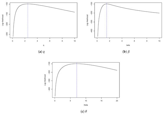 Figure 4 shows plots of estimated densities for the models with the probability histogram and the profile log-likelihood function of q, , and in Figure 5. In Figure 4, we note that the SQG distribution presents a good fit with the data due to the concavity characteristics of the density function along with presenting a heavy tail. We can also see the effect on the curvature of the density, which occurs by taking the as explained in the comment after Definition 1. Finally, we have the qqplots for the quantile residual in the models and the values p. Figure 6 shows that the SQG model fits better than the other models considered.