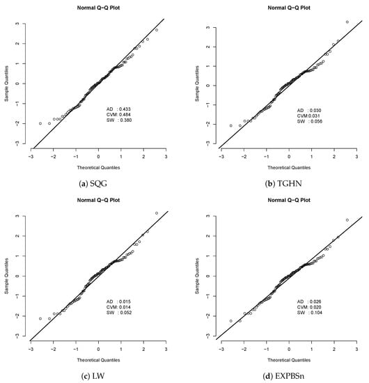 Residual quantile for the fitted models to life of fatigue fracture data set. The p-values for the Anderson–Darling (AD), Cramer–Von Mises (CVM), and Shapiro–Wilk (SW) normality tests are also presented to check if the residual quantile came from the standard normal distribution. At a 5% significance level, for the three normality tests for the residual quantile, results suggest that the SQG model is appropriate for this data set while the rest of the models are not.