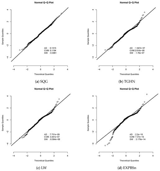 The Akaike and Bayesian criteria are used to compare non-nested models where the model with lower AIC and BIC is suggested. To be more certain, we also performed a goodness of fit validation, and Anderson–Darling (AD), Cramer–Von Mises (CVM), and Shapiro–Wilk (SW) normality tests were performed for quantile residuals [].