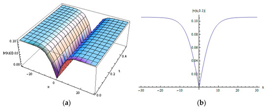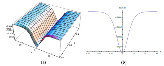 (a) A 3-D solitary wave figure of in Equation (18) as , for and , (b) 2-D figure of for .