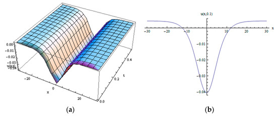 (a) A 3-D solitary wave figure of in Equation (16) with , for and , (b) 2-D figure of for .