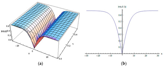 (a) A three dimensional (3-D) solitary wave figure of in Equation (16) with , when and , (b) 2-D figure of for .