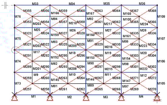 The cross sections of the lower chords have been changed to Φ 60 mm × 3 mm (537 mm2), Φ 60 mm × 4 mm (704 mm2), Φ 63 mm × 5 mm (911 mm2) in turn, to compare their element importance. The upper surrounding nodes are all fixed with the other boundary conditions unchanged. The nodal load is 20 kN in the vertical direction. The element number is shown in Figure 3, and the result is given in Table 2.