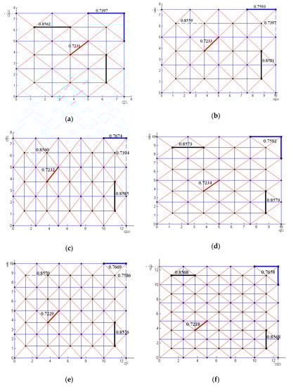 It can be seen from Figure 4 that the positions of key elements in the web remain unchanged and not affected by the number of grids. When the plane of the grid is square, the numbers of the most important upper and lower chords are both two chords. When the plane of the grid is rectangular, the most important upper chord is located at the most central position along the horizontal direction, and the most important lower chord is located near the axis of symmetry in the vertical direction. Although the number of grids affects element importance indices, it does not significantly change the corresponding positions. When the grids are determined, the locations of key elements are determined.