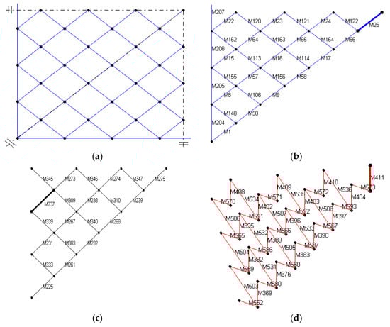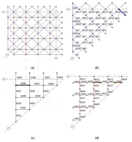 A biorthogonal diagonal lattice grid structure: (a) the quarter of the model; (b) the number of the upper chords; (c) the number of the lower chords; and (d) the number of the web members.