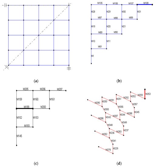 A biorthogonal lattice grid structure: (a) a quarter of the model; (b) the number of the upper chords; (c) the number of the lower chords; and (d) the number of the web members.