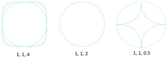 Standard ellipses can be generated with . For , curves are inscribed in that ellipse, i.e., they fit inside it, and the curve is called hypoellipse. For , curves are circumscribed about that ellipse, i.e., that ellipse fits inside the curve, and the curve is called hyperellipse. In the limit case where n is infinite, a rectangle is obtained [14]. Figure 1 shows examples of superellipses. The first one is a hyperellipse, the second one is a circumference and the third one is a hypoellipse.