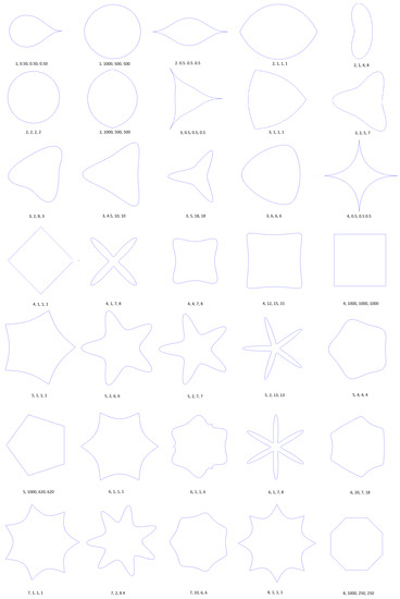 Gielis curves examples. For all the examples, a = b = 1, the values that are shown correspond to m, , and from Equation (2), respectively.