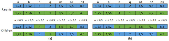 Figure 3. Crossover examples. For each gene, a random value between 0 and 1 is obtained. If ≤ the first child takes the gene from the first father (in blue) and the second child takes the gene from the second father (in green). If > 0.5 the first child takes the gene from the second father (in green) and the second child takes the gene from the first father (in blue). (a) Shows crossover in which the condition that p and q should be relative primes is not fulfilled. (b) Shows the correction applied in order to fulfill the condition. - In order to perform mutation on continuous variables (a, b, , , ), a normal distribution is used as follows:where N is the normal distribution, is gene i, is the interval length of the variable represented by gene and k is a user defined parameter, the suggested value is (0.1). Then, mutation is performed with a normal distribution with a standard deviation of a tenth of the interval length of the variable.