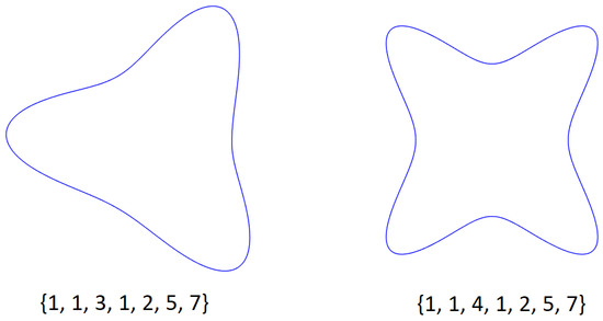 - Discrete variables (p and q in this case) indicate the number of sectors of the Gielis curve and the maximum number of self-intersections, respectively. When performing mutation, small variations of these variables have no reason for being, since they produce big changes in the adaptation to the sample points. This can be observed in Figure 4, where both Gielis curves have the same parameters, except p, but they have completely different shapes. For this reason, it is suggested to simply generate random values, with the condition that p and q must be relative prime.