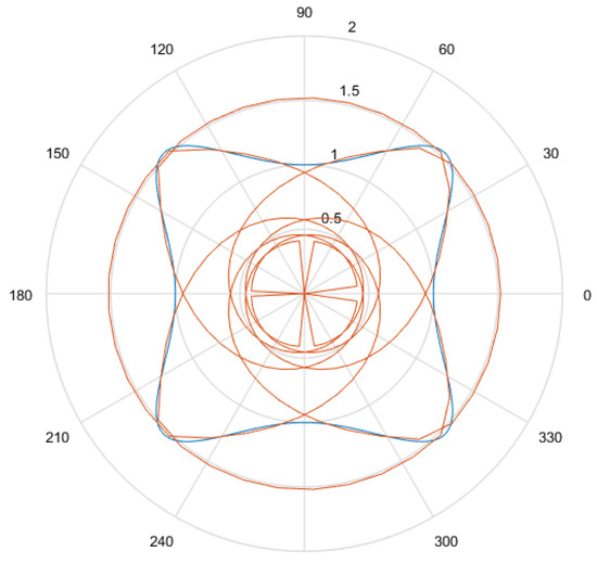 The function given by Equation (6) is not good enough for obtaining satisfactory results [11]. An example can be seen in Figure 6, where the generated Gielis curve has segments that approach the original curve. The generated Gielis curve also has segments that self-intersect and do not correspond to the original curve.