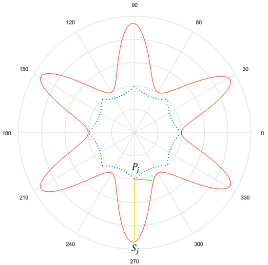 The length of the Gielis curve is not related to the sample points, as observed in Equations (7) and (8), whose input parameters are solely the superformula parameters and not the sample points. As we need a metric that penalizes the segments from the generated Gielis curve that are far from the sample points, we suggest a new metric instead of the length. The computing of this metric is as follows: