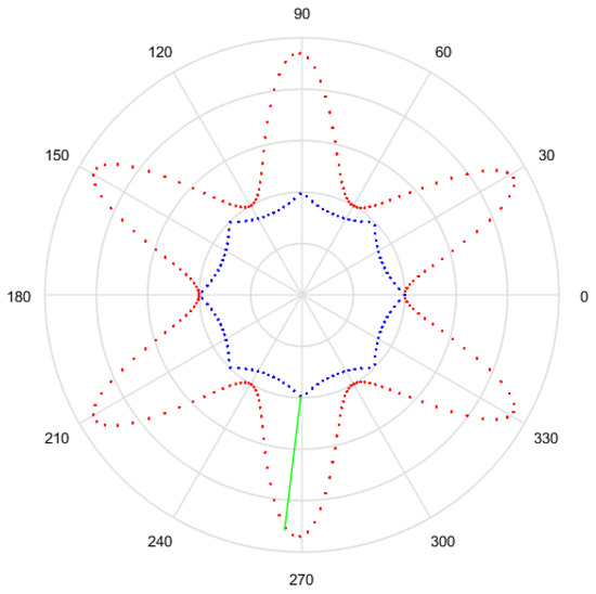 - Obtain a finite amount of points from the generated Gielis curve, to equals intervals of , with a sampling. An example of this is observed in Figure 9, with the points in red.