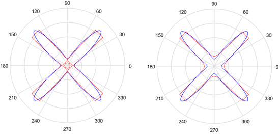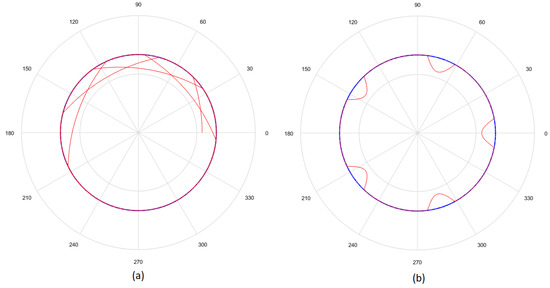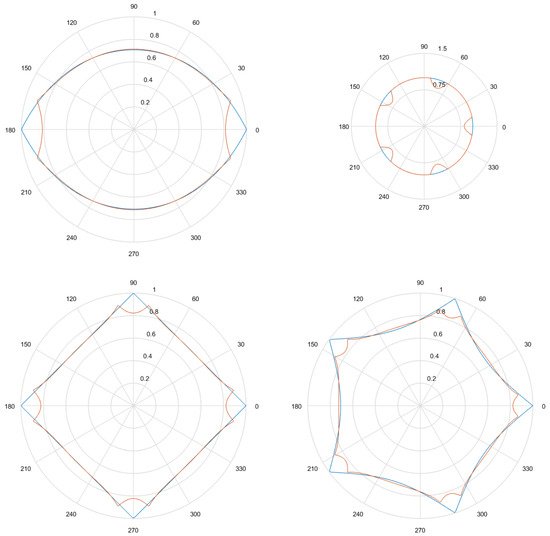 Figure 10 shows a case in which this objective function presents a better result than . The method that uses generates a Gielis curve that is self-intersecting near the polar axis, while the method that uses is not self-intersecting and because of this it presents a better adjustment to the original curve.