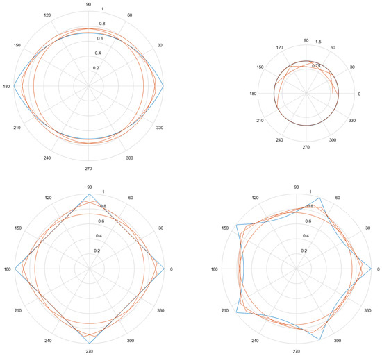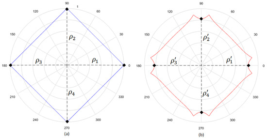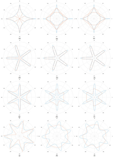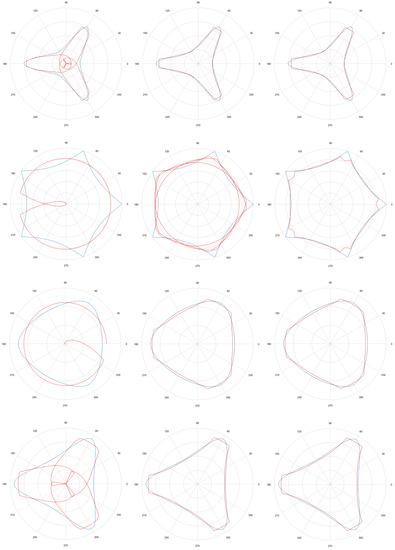 - Considering a h-dimensional space, finite representation of the original curve and the solutions obtained with each method are built, with polar distances (, ,..., ) for each of them. We denote as the original curve, as the Gielis curve from the method proposed by Fougerolle et al., as the curve from the method that uses objective function from Equation (13) and for the method that uses our contribution, the objective function from Equation (14). In the example from Figure 13, there are and .