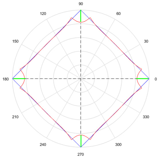 Figure 14. . The original curve is in blue and the Gielis curve is in red. The metric corresponds to the root square of the sum of squares of the segments in green, i.e., Euclidean distance.