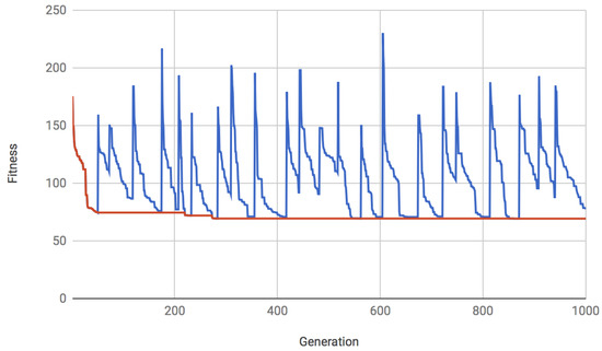 Tests are performed to determine the impact from the mutation and crossover operators using two strategies: the first strategy was to modify the mutation parameter k, the mutation rate and the standard deviation threshold for population re-initialization; and increasing the number of iterations for greater exploration. Applying this strategy, the standard deviation of the population is high and the algorithm does not converge. The second strategy consists in increasing the size of the population by 10, 50 and 100 times. The results are similar, so the conclusion is that performing re-initialization of a small population is more effective than trying to perform a search around local minima or handle big populations [11].