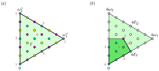 (a) The fundamental domain F of , depicted as the equilateral triangle, contains 10 cyan nodes of the point set , nine magenta nodes of , and nine yellow nodes of . The nodes without the dotted ones on the boundary of F depict the four cyan points of , three magenta points of , and three yellow points of . The red numbers represent the values of the discrete ϵ-function (18). (b) The domain 6FQ of , depicted as the