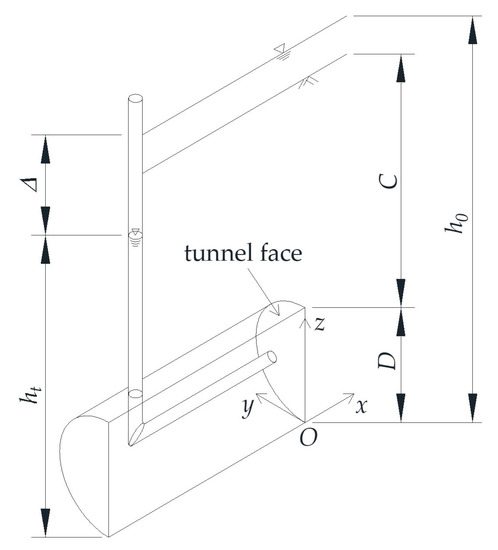 Cao et al. [17] obtained a three-dimensional solution for pore water pressure distribution in front of the tunnel face through Equations (1) and (2), but did not consider the distribution of pore water pressure behind the tunnel face. Here, is the pore water pressure; is the unit weight of water; is the equivalent height of the tunnel in this paper, .